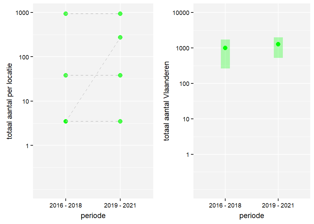 Figuur 3.25: Links: totale populatiegrootte van Harlekijn per locatie; rechts totaal geschatte populatiegrootte van Harlekijn voor Vlaanderen