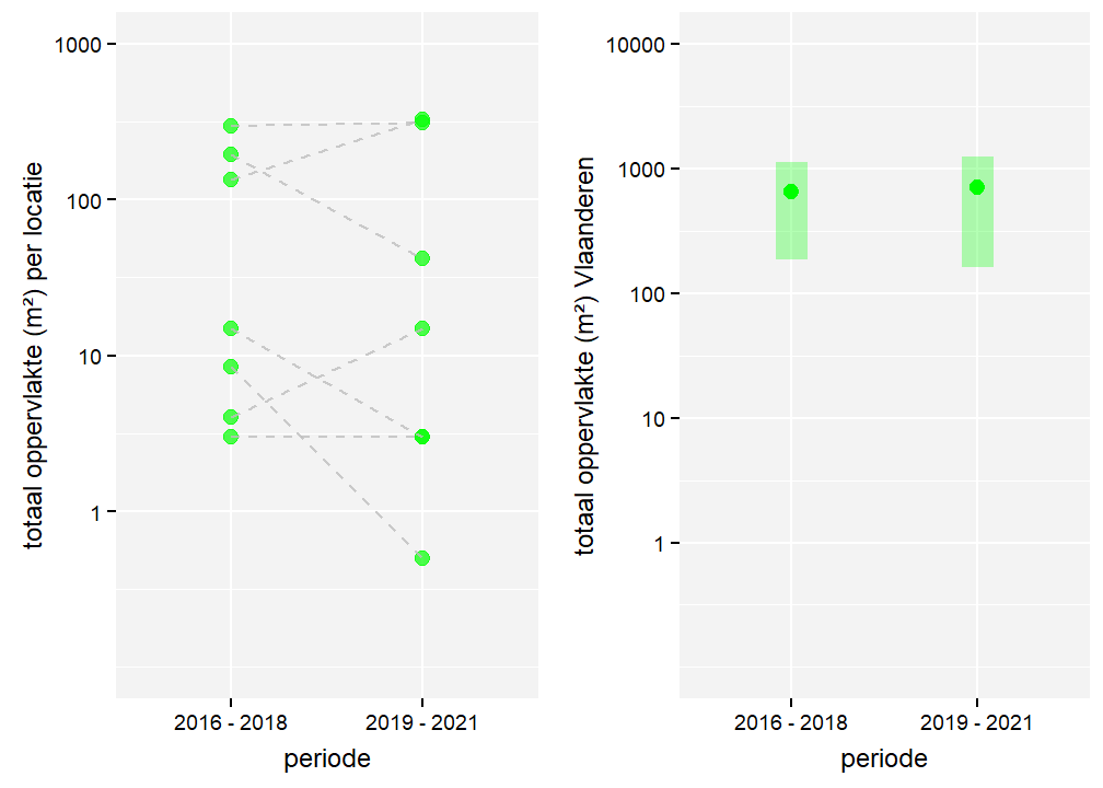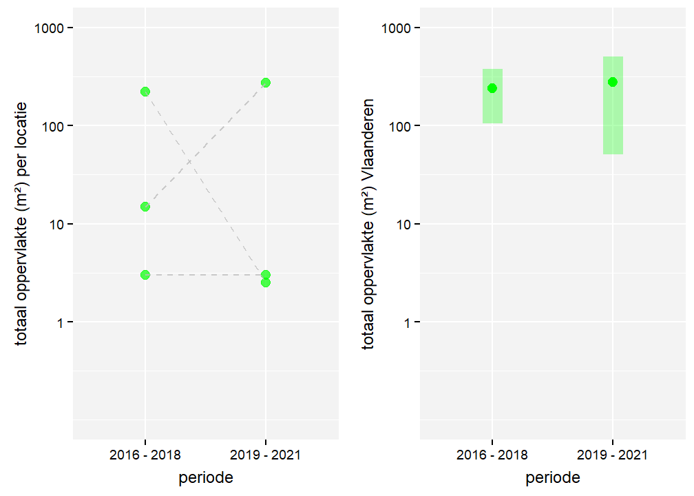 Op de meeste groeiplaatsen is de omvang van de populaties (uitgedrukt in bezette m²) gelijk gebleven of licht toegenomen in de meetperiode 2019-2021 in vergelijking met de periode 2016-2018. Op de meetnetlocatie langs de linkeroever van de Schelde tussen Uitbergen en Schoonaarde is de soort aanzienlijk meer waargenomen in de laatste meetperiode. Langs de rechteroever tussen Uitbergen en Schoonaarde is de soort niet meer waargenomen in de laatste meetperiode, terwijl dit een van de grootste populaties was. Ook op de meest stroomafwaarts gelegen locatie in Bornem, deelgemeente Hingene, is de soort niet meer waargenomen.